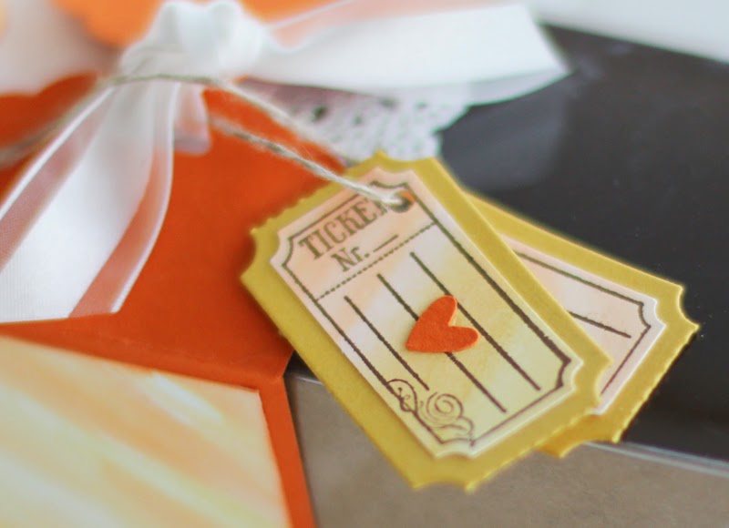 Aufgefüllt hatte ich die kleine Schachtel nicht. Immerhin musste das ganze ja im Flieger mit! ;o) Aber es ging ja auch nicht um den Inhalt, sondern um die Gestaltung. Wie zuvor schon mal habe ich die Box mit Hilfe der Anhängerstanze und einem Zierdeckchen verschönert. Hingucker sind dazu die kleinen Ticketanhänger und natürlich die Blume. Dieses Mal habe ich die Spiralblume zweimal ausgestanzt und zusammengerollt. Der "Trick" für die Blume ist, dass ich beide Seiten des Papieres in der Aquarelltechnik eingefärbt habe, ehe ich das Ganze durch die Big Shot gekurbelt habe. Immerhin kann man bei diesen Blumen beide Seiten sehen. Da sollten auch beide eingefärbt sein.