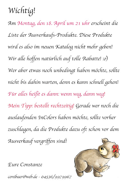 Das Wichtigste zuerst, da viele auch schon danach gefragt haben: am Montag, den 18.04.2016 um 21 Uhr erscheint die "Liste der letzten Gelegenheiten" und der große Ausverkauf beginnt! Für die, die das noch nicht kennen: dies ist der Moment, in dem veröffentlicht wird, welche Artikel von Stampin´ Up! es mit dem neuen Katalog nicht mehr geben wird. Wir alle hoffen dabei natürlich auch tolle Rabatte. ABER es gilt: wenn weg, dann weg! Und glaubt mir, das kann schnell gehen (einige erinnern sich vielleicht noch ans letzte Jahr?!)! Daher empfehle ich euch, eure Wunschliste noch einmal durchzugehen und die Dinge, die dort ganz oben stehen, rechtzeitig, also vor dem Erscheinen der Liste, noch zu bestellen. Dies gilt auch für die InColors 2014 - 2016. Diese werden auf jeden Fall bald nicht mehr erhältlich sein und es kam schon oft vor, dass die Produkte mit diesen Farben schon vor dem eigentlichen Ausverkauf bereits vergriffen waren. Wer also da seine Vorräte noch aufstocken will, sollte das baldmöglichst machen! Noch einmal zur Erinnerung die Farben: Lagunenblau, Orangentraum, Brombeermousse, Waldmoos und Honiggelb.